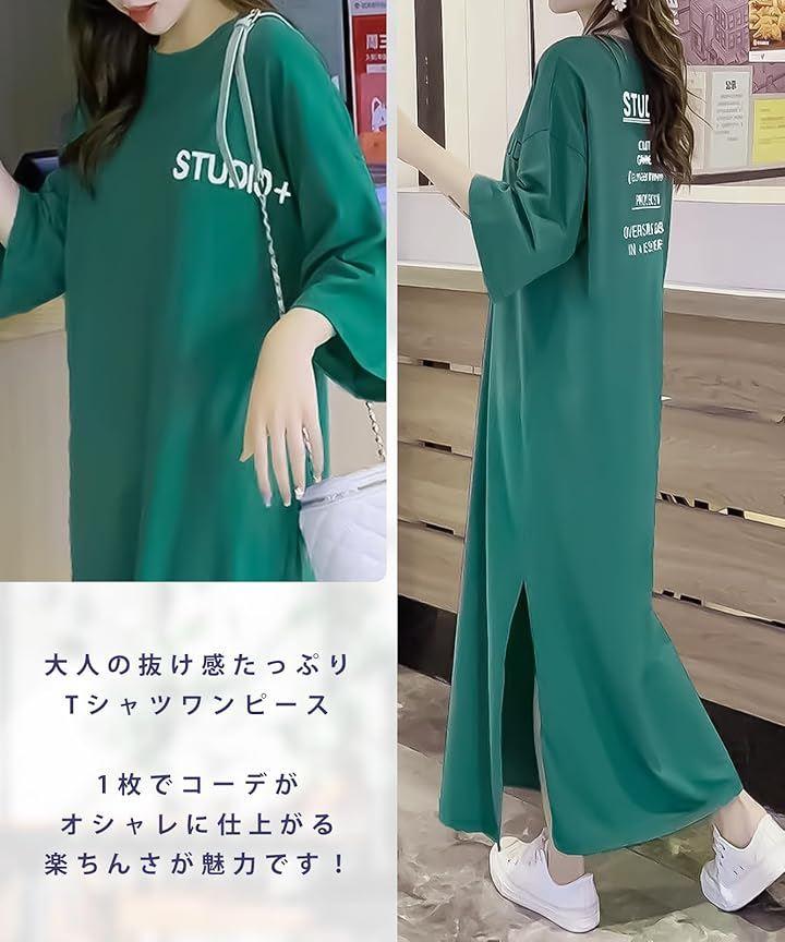 「カジュアルもかわいく決まる、大人のロゴ入りマキシワンピース」胸元にはさりげない英字ロゴ、背中には大胆なテキストデザインをあしらった、大人の抜け感たっぷりなTシャツワンピース。