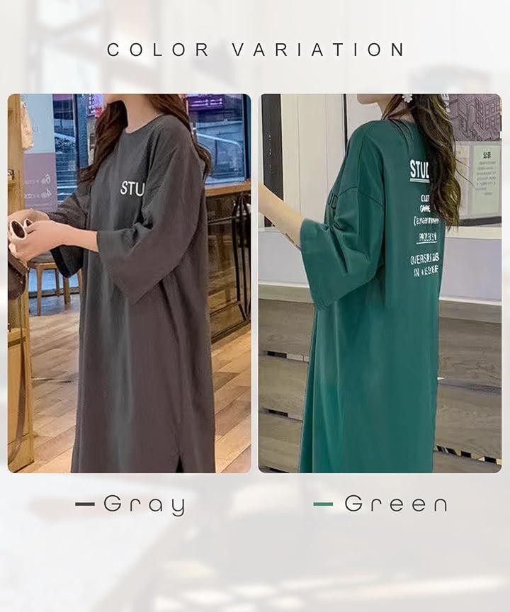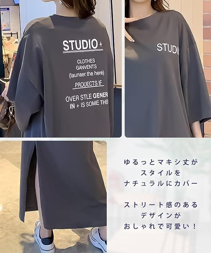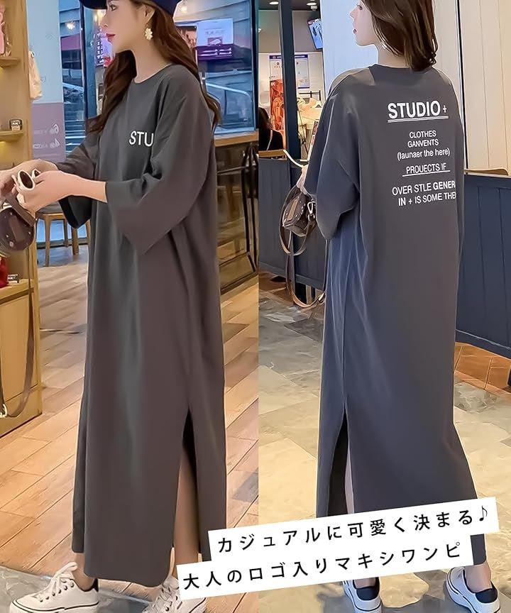 「カジュアルもかわいく決まる、大人のロゴ入りマキシワンピース」胸元にはさりげない英字ロゴ、背中には大胆なテキストデザインをあしらった、大人の抜け感たっぷりなTシャツワンピース。