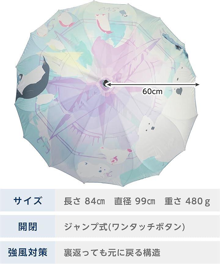 [耐風] いつも風で骨が折れてしまう...という方に ・メインの骨がすべて釣り竿のようにしなるグラスファイバー製 ・メインの骨がグラスファイバー製だからさびにくくて劣化しにくい ・通常の倍の16本も骨がある ・お花のような形の特殊な組み方をしている 「風でひっくり返ってしまっても一瞬で戻せるくらい」とっても丈夫なんです。 [使いやすさ] ・石突きの先端は滑りにくいラバー製 ・ヒラヒラしない止めベルト、自然に本体に付くよう考えた面ファスナー付 ・ニットにひっかっからない。すっきりとしたジャンプボタン [一枚張り(シームレス)] ・縫い目のない一枚張りの生地 ・まるで絵画のようなイラストを全面に表現 ・縫い目からの雨漏りリスクを軽減 通常の婦人傘では小さく感じるけど紳士傘を持つのはちょっと違う...という方に ・16本の骨があることで、生地面積が広くなるから同じ大きさでも差したときだけちょっと大きめ ・メインの骨がグラスファイバー製だから鉄製の骨よりもちょっと軽量 ・紳士傘と違って華やかなデザインが豊富 [スペック] *素 材 生地:ポリエステル100%/骨:グラスファイバー *サイズ 親骨の長さ:60cm *全長総丈の長さ:84cm *重さ重さ:480g 「ご注意」 *撥水性の高い柔らかい生地の特性上、通常の傘よりシワが見受けられる場合がございます。