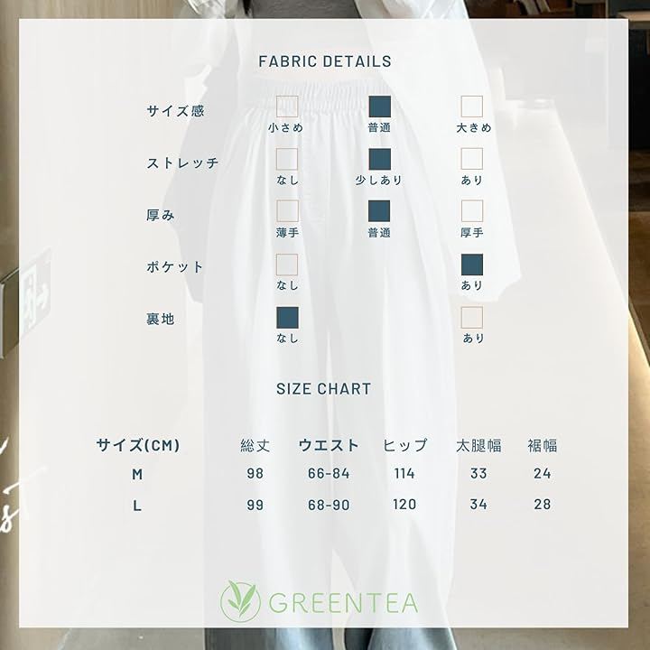 Mサイズ:総丈/98 ウエスト/66-84 ヒップ/114 太腿幅/33 裾幅/24 Lサイズ:総丈/99 ウエスト/68-90 ヒップ/120 太腿幅/34 裾幅/28