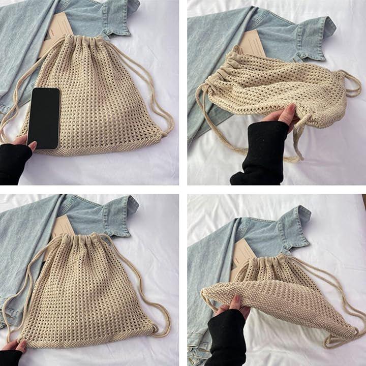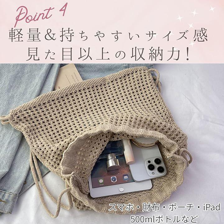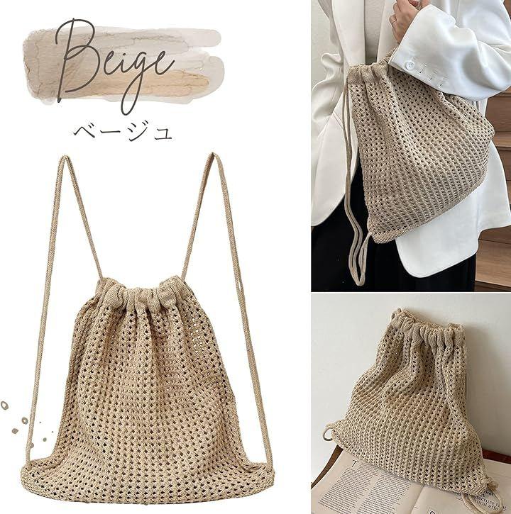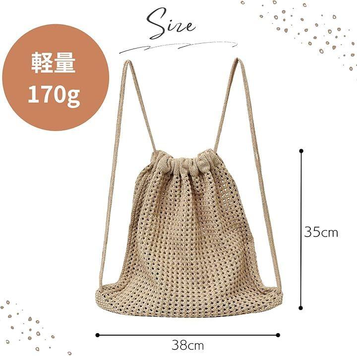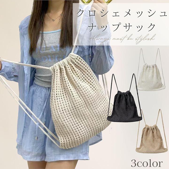 「カジュアルすぎないラフさが魅力」 定番のナップサックをクロシェ編みメッシュで仕上げることで、軽やかさの中にこなれ感をプラス。