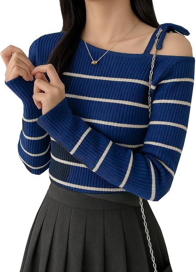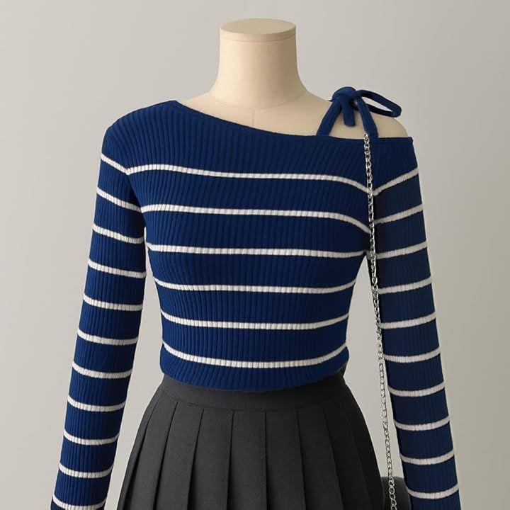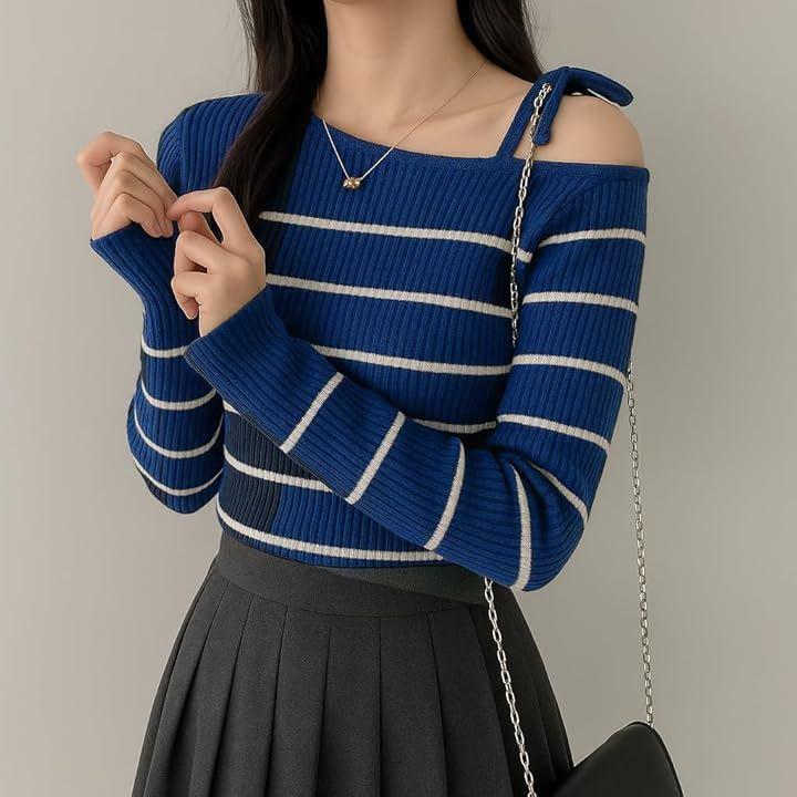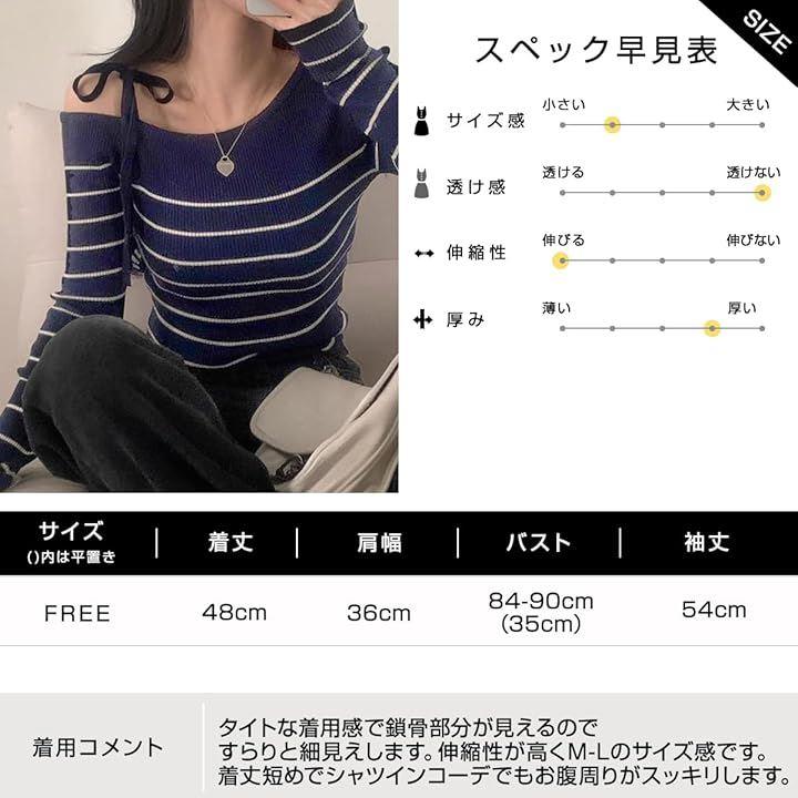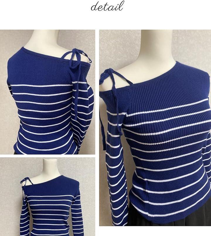 「韓国で人気のリボン付き 肩見せ ニット トップス」タイトな着用感で細見えします。