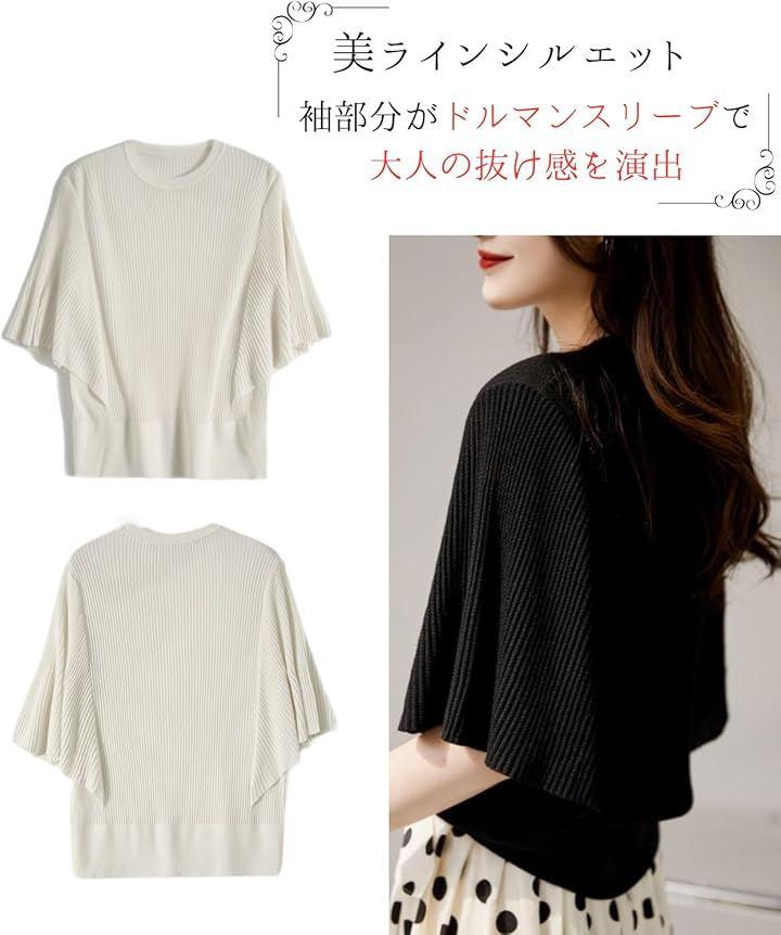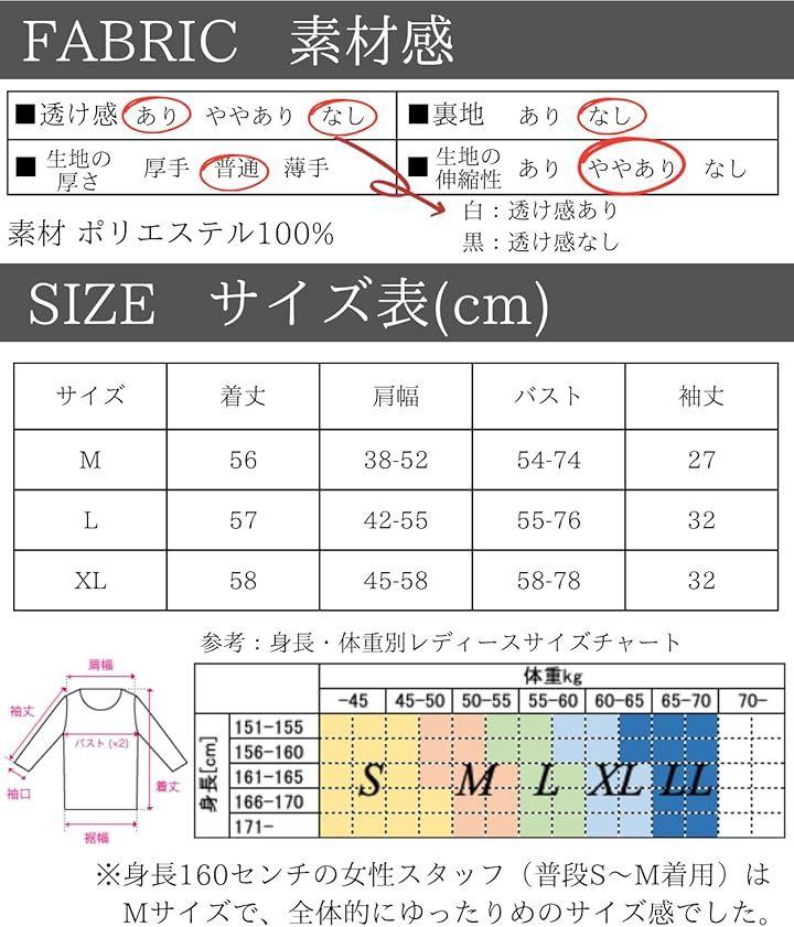 「素材」ポリエステル100%「カラー」黒(ブラック) 白(ホワイト)「サイズ(cm)」M 着丈56/バスト54-74/肩幅38-52/袖丈27 L 着丈57/バスト55-76/肩幅42-55/袖丈32 XL 着丈58/バスト58-78/肩幅45-58/袖丈32