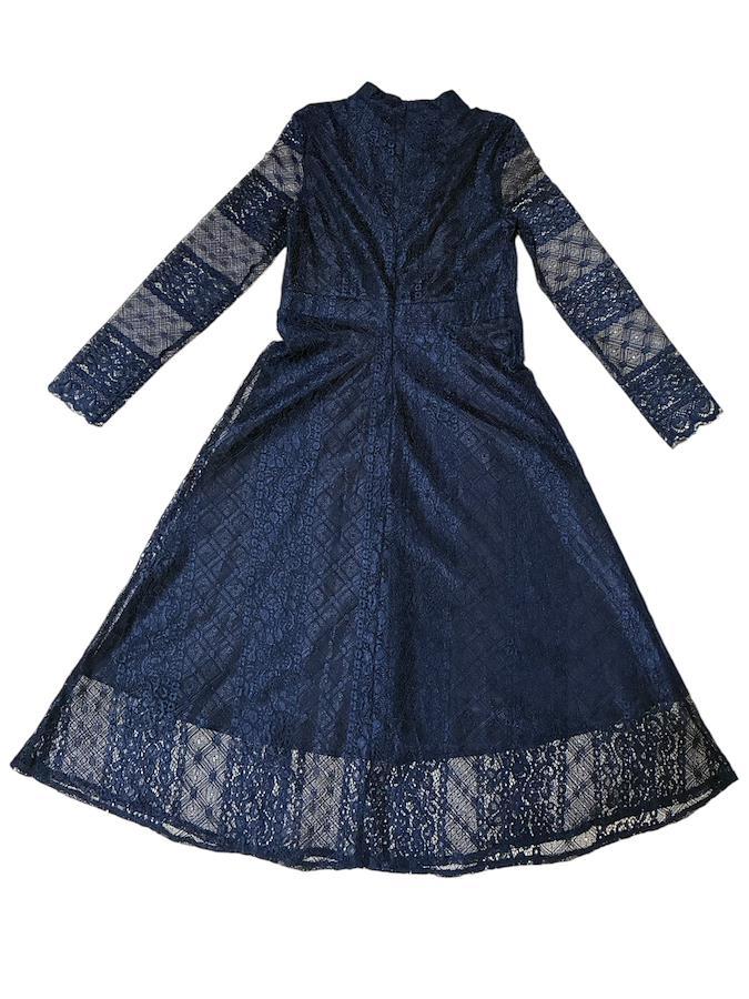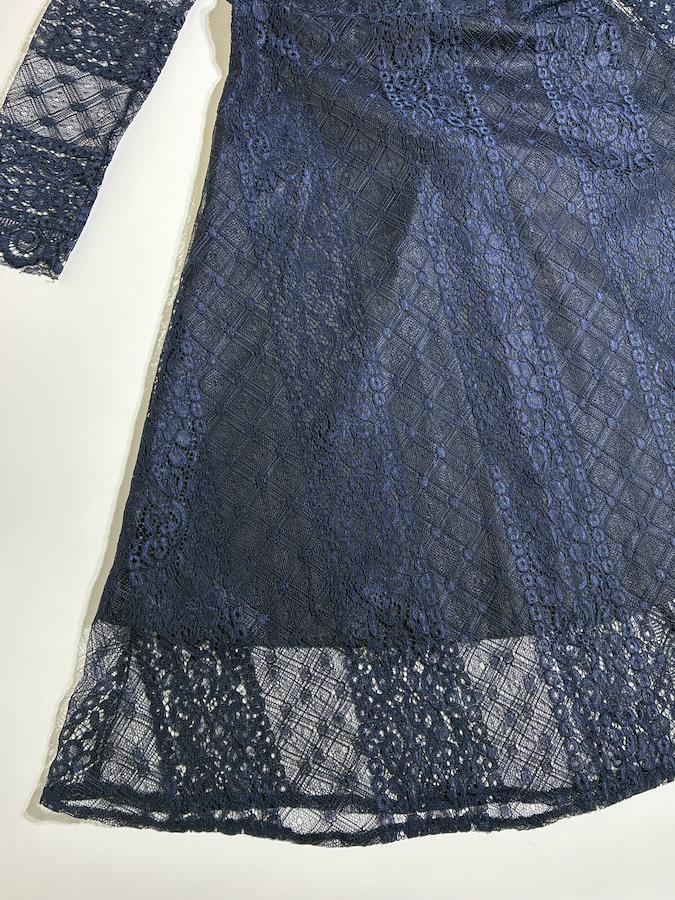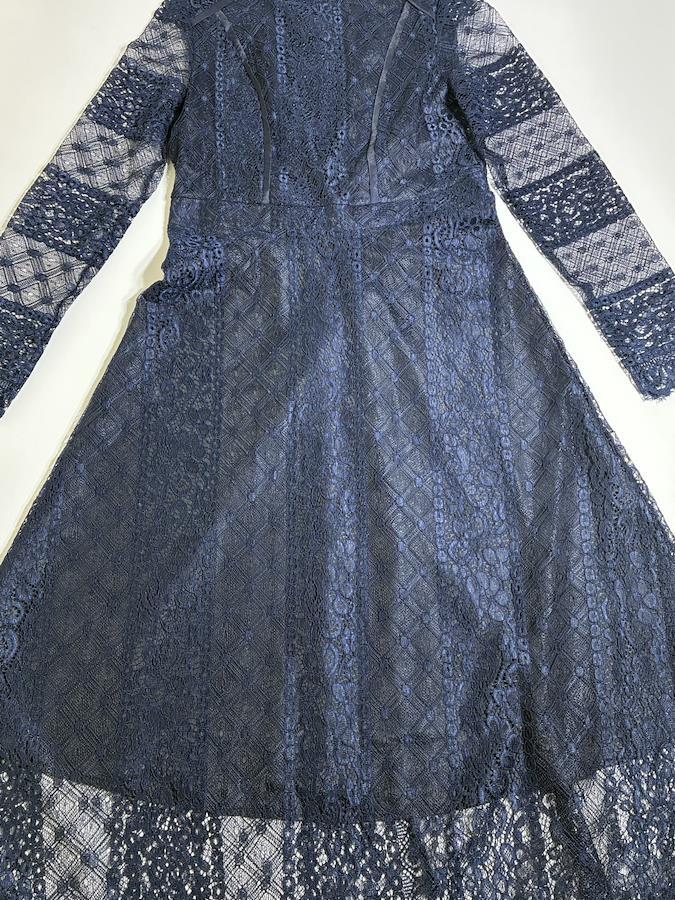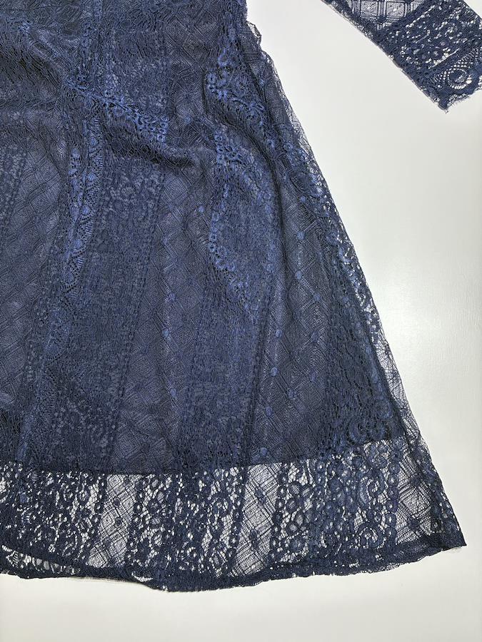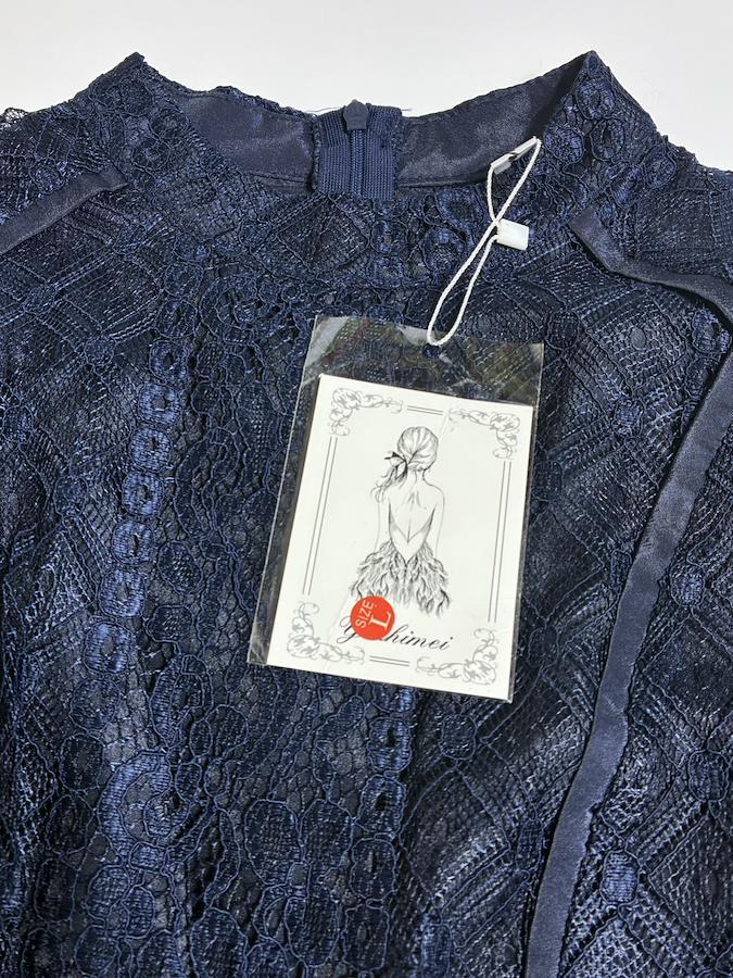 (Lサイズ)上品レースがポイントの個性的なワンピース。シンプルなネイビーでも立体感のあるデザインがお洒落。ドレッシーになり過ぎない適度なきちんと感で、結婚式はもちろんディナーやデートにも使いやすいアイテム。膝もしっかり隠れる安心の丈感です。(肩幅、約37㎝)(袖丈、約61㎝)(身幅、約41㎝)(着丈、約117㎝)