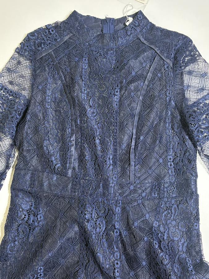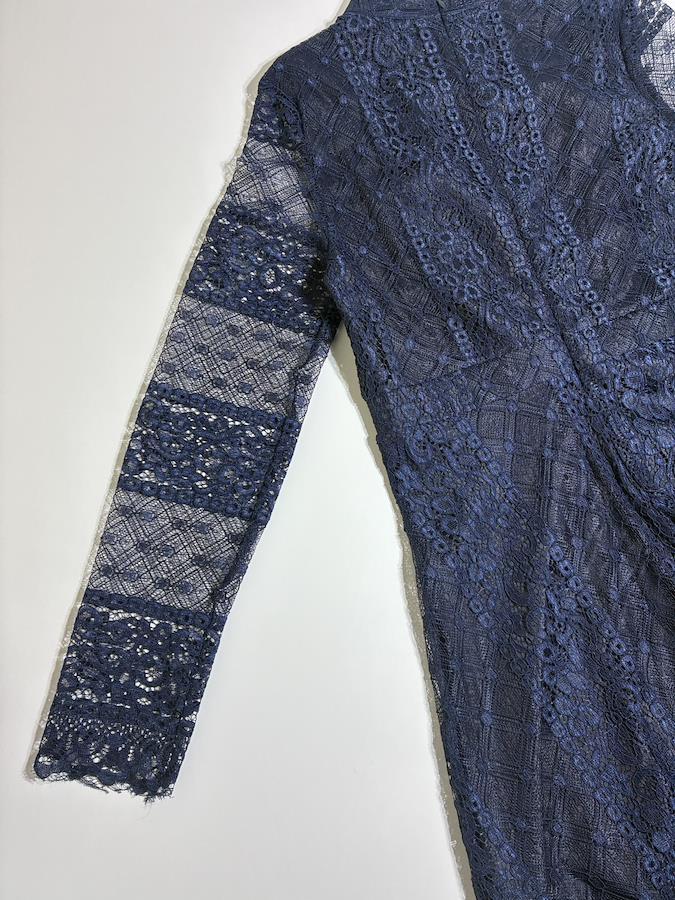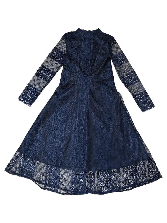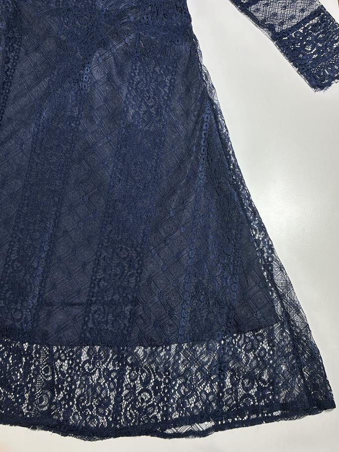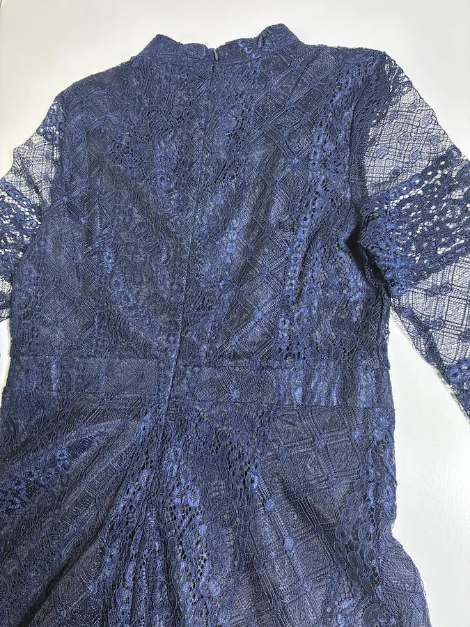 (Lサイズ)上品レースがポイントの個性的なワンピース。シンプルなネイビーでも立体感のあるデザインがお洒落。ドレッシーになり過ぎない適度なきちんと感で、結婚式はもちろんディナーやデートにも使いやすいアイテム。膝もしっかり隠れる安心の丈感です。(肩幅、約37㎝)(袖丈、約61㎝)(身幅、約41㎝)(着丈、約117㎝)