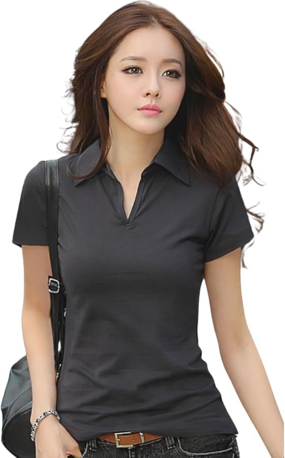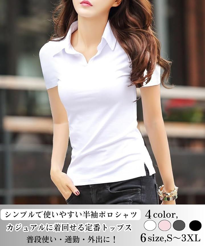 「普段使いしやすいシンプルデザイン」半袖&長袖の襟付きVネックデザインのレディーストップスです。