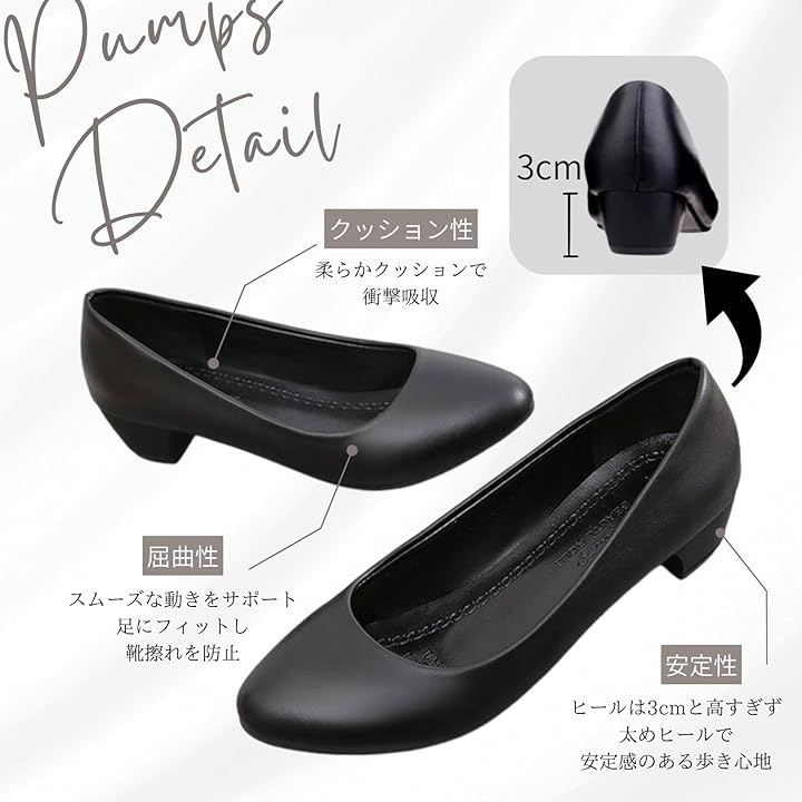 3cmヒールでも、歩行音を抑える静音ソールにより、面接や会議など静かな空間でも集中を妨げません。