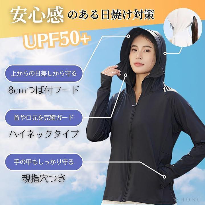 「360°ガードと高いデザイン性 」8.5cmのつば付きフードと顔まで隠せるハイネックデザインが強い紫外線から肌を守ります。