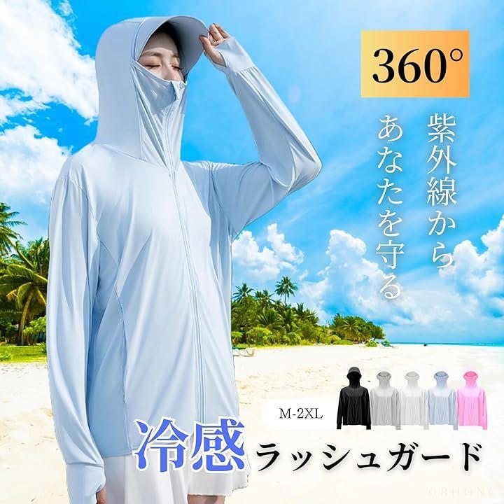 「360°ガードと高いデザイン性 」8.5cmのつば付きフードと顔まで隠せるハイネックデザインが強い紫外線から肌を守ります。