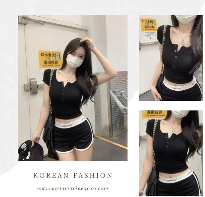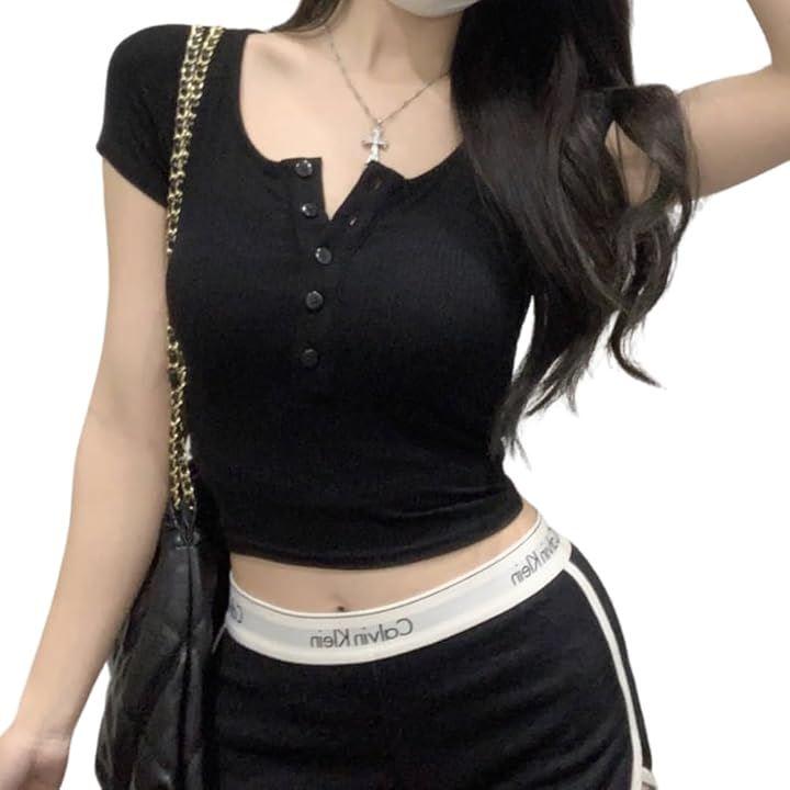 Women's Ribbed Cropped T-Shirt, Short Sleeve, Front Buttons, Square Neck, Ribbed Material, Tight Fit, Solid Color, Simple, Korean Style, Slimming, Stylish, Street Style