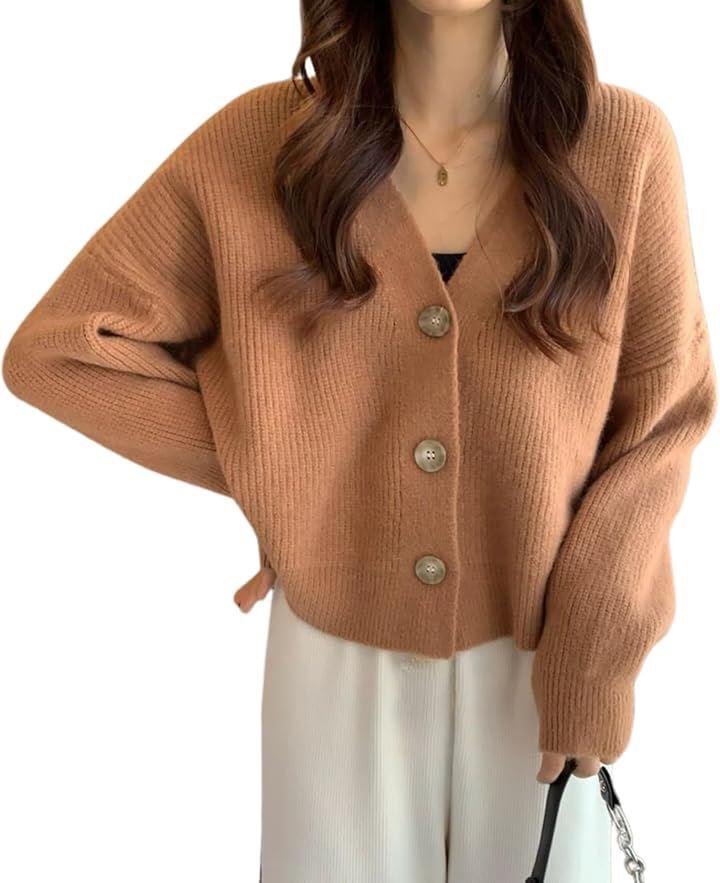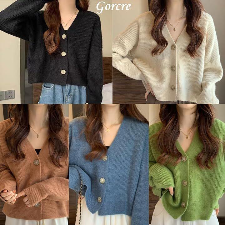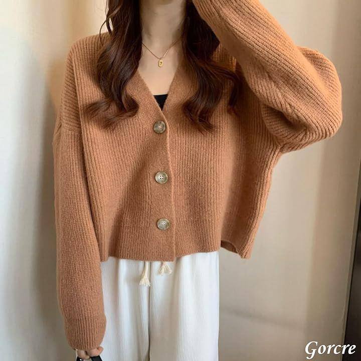 着丈が短めで横幅がややゆったりしたニットカーディガンです。