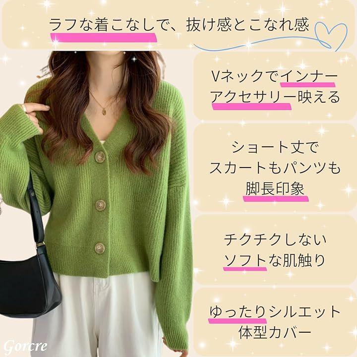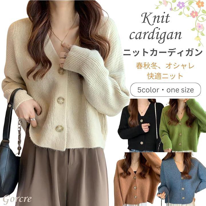 着丈が短めで横幅がややゆったりしたニットカーディガンです。