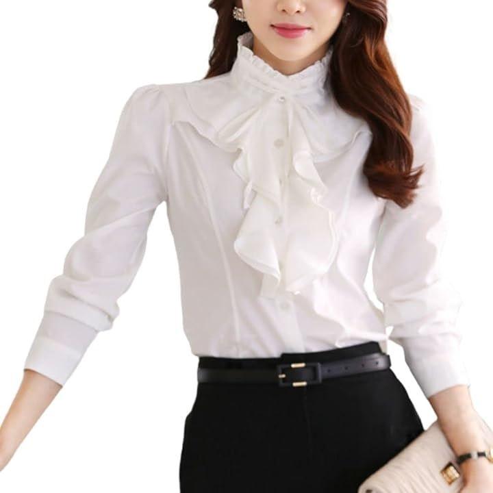 胸元のフリルと大きめのリボンが印象的な長袖のフリルブラウス。