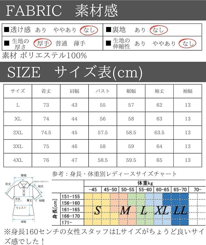 「素材」100%ポリエステル 「カラー」黒、赤、ピンク、グリーン、パープル「サイズ(cm)」L 着丈73/肩幅43/バスト55/裾幅57/袖丈62/袖幅13 XL 着丈74/肩幅44/バスト56/裾幅58/袖丈63/袖幅13 2XL 着丈74.5/肩幅45/バスト57.5/裾幅58.5/袖丈63.5/袖幅13 3XL 着丈75/肩幅46/バスト58/裾幅59/袖丈64/袖幅13 4XL 着丈76/肩幅47/バスト58.5/裾幅59.5/袖丈65/袖幅13