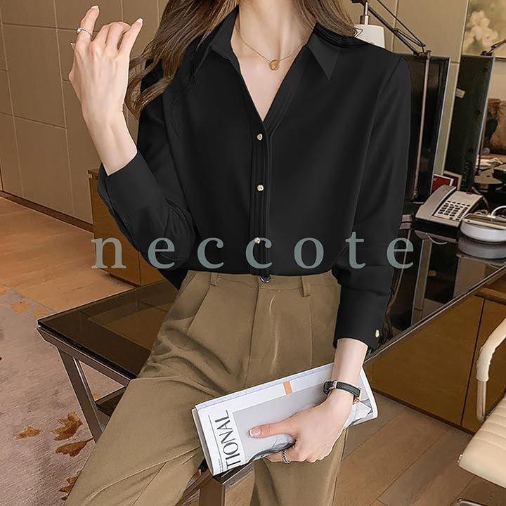 「好印象&オシャレを叶えるスキッパーデザインのブラウス」エレガントですっきりとしたVネックデザインにビジューボタンがアクセントになった、お洒落な長袖シャツです。