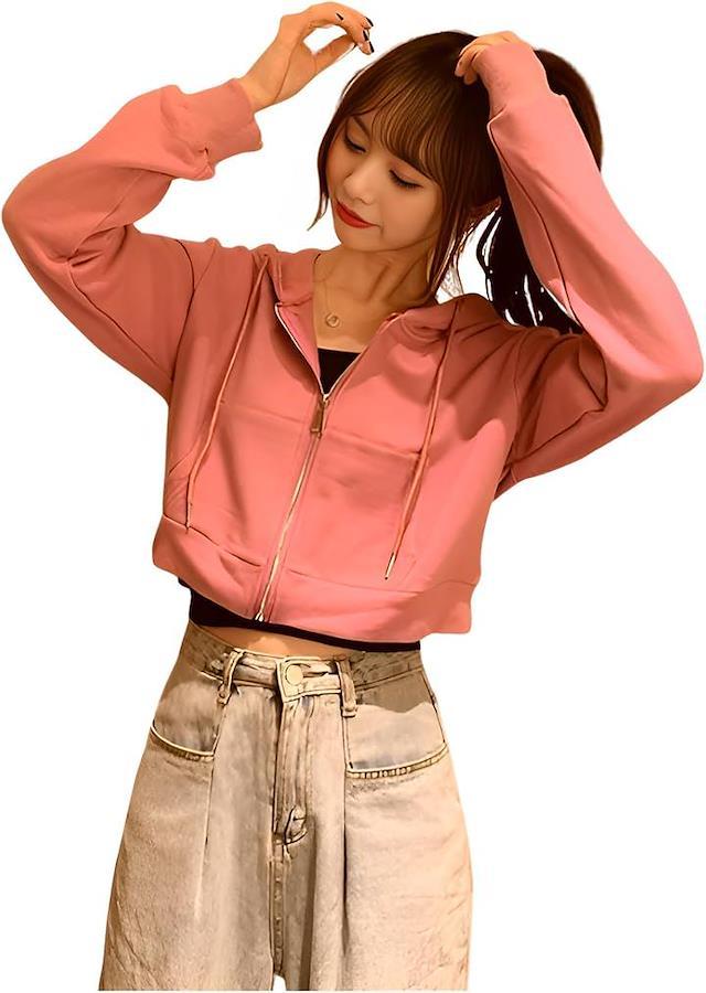 *「人気のへそ出しショート丈フード付きパーカーは、カジュアルでおしゃれなスタイルを叶える魅力的な必須アイテム。」ショート丈のデザインは、ラフなスタイリングが好きな方や韓国トレンド感を取り入れたい方にぴったりです。
