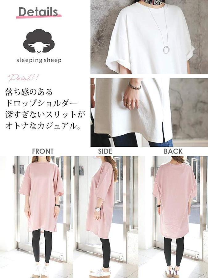 *デザイン性*ドロップショルダーにハーフスリーブ仕上げですっきりストンと膝まで落ちる丈感と裾サイドのスリットで動きやすく涼しげな印象を与えてくれます。
