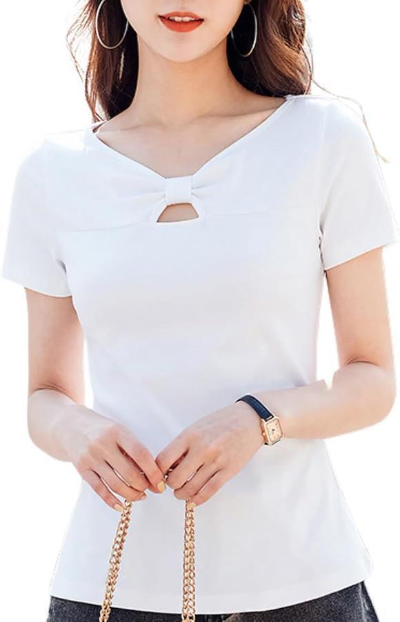 「特徴(1)」胸元のリボンがアクセントになったワンポイントtシャツで、可愛い服レディースとしてシンプルながらも華やか。