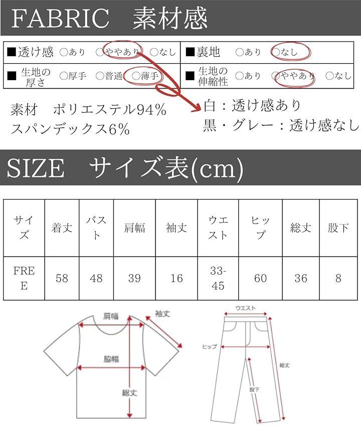 「素材」ポリエステル94% スパンデックス6%「カラー」グレー、ホワイト、ブラック 「サイズ(cm)」 FREE 着丈58/肩幅39/バスト48/袖丈16/ウエスト33-45/ヒップ60/総丈36/股下8