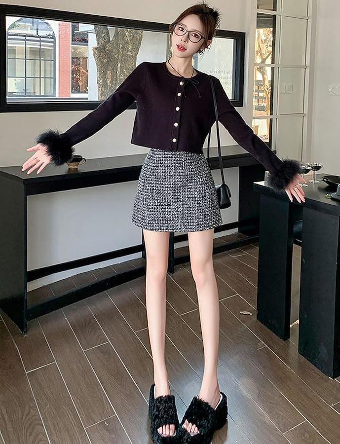 さりげなくラメの入ったツイード生地でセクシーなミニスタイルでもエレガント感のある装いに。
