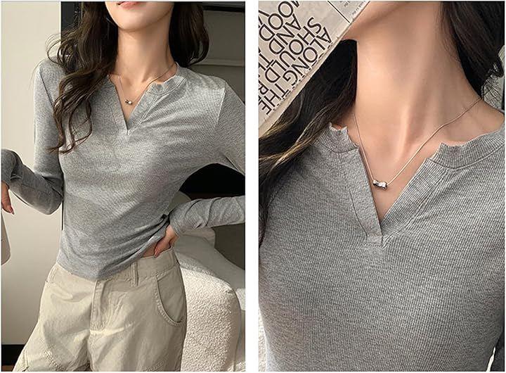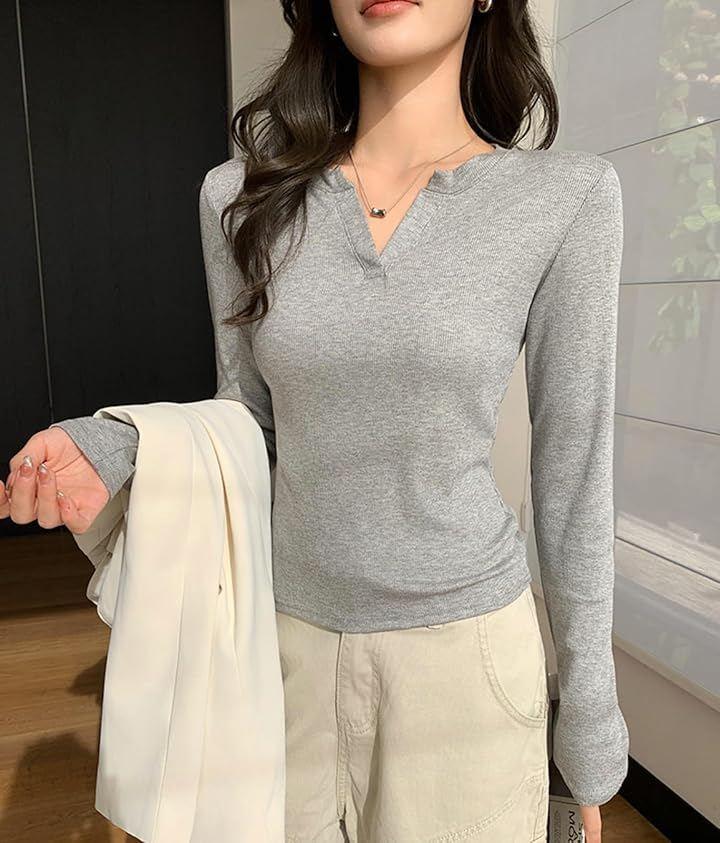 Women's Slim Fit Long Sleeve Top with Ribbed V-Neck, Solid Color, Stylish Casual Style, Simple and Stylish, Korean Style, Long Sleeve T-Shirt