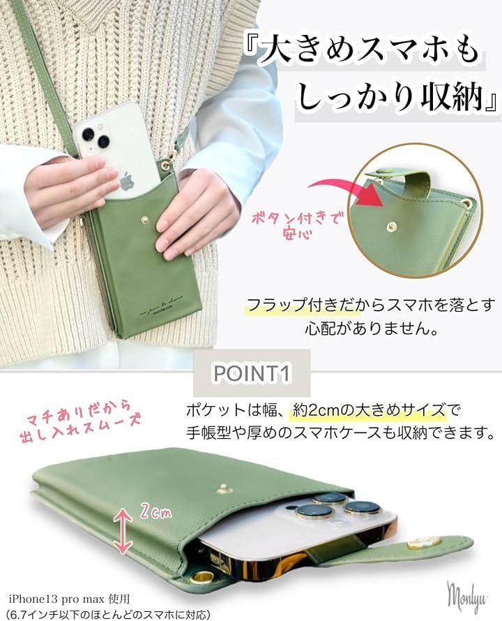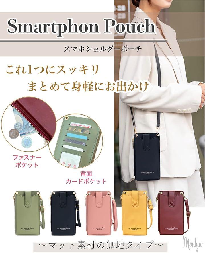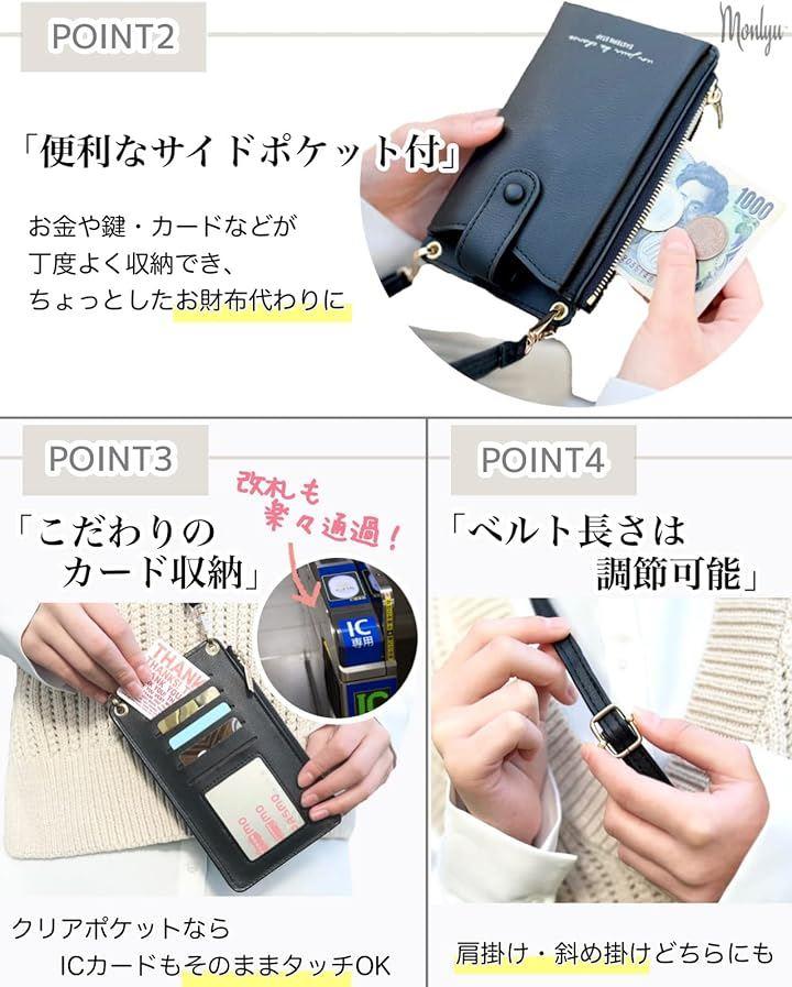 「お出掛けの必須アイテム」 スマホ専用ポケットに裏面カードポケット、サイドにはファスナーポケット。