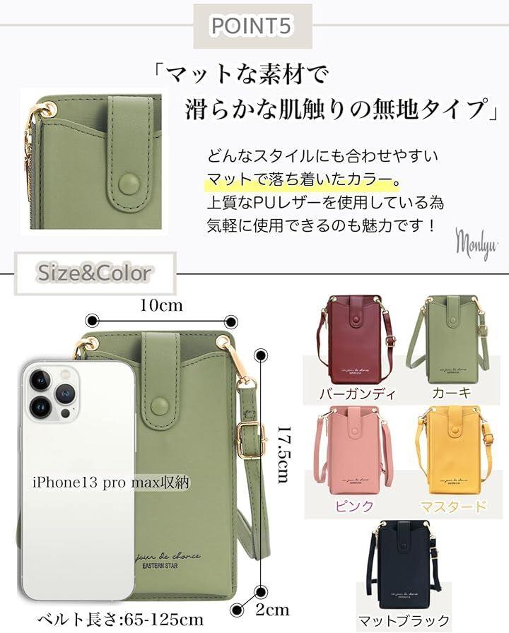「仕様・サイズ」 カード入れx5・スマホポケットx1・ファスナーポケットx1 (サイズ)縦17.5cm 横10cm マチ2cm ショルダーベルト65-125cm(*ご使用のスマホケースにより収納できない場合もございますのでご注意ください。