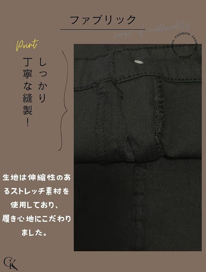 シンプルで洗練されたブラックカラーは、あらゆるトップスとの相性が良く、脚長効果も期待できます。