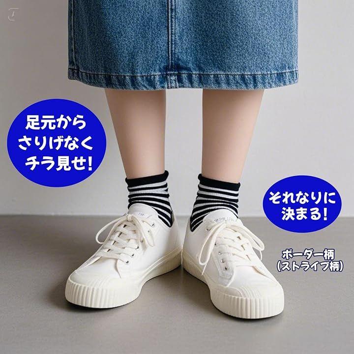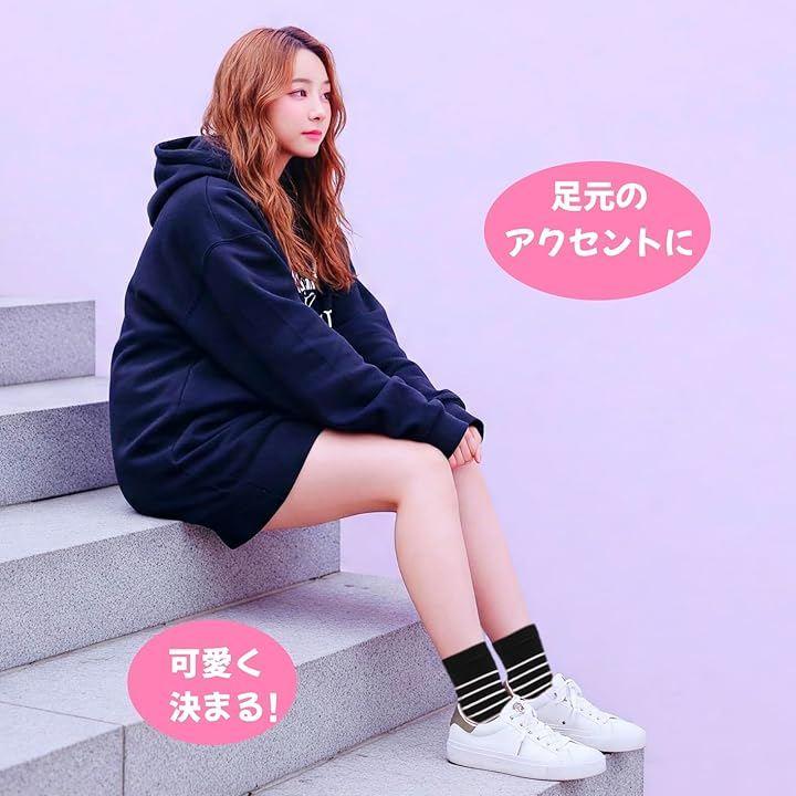 黒と白のストライプ柄のソックスはデザイン違いの2足組なので、その日の気分や服装に合わせて使い分けが出来て、パンツと靴との間のアクセントに。チラ見せするだけでさりげなく、おしゃれをアピール。可愛く決まる。
