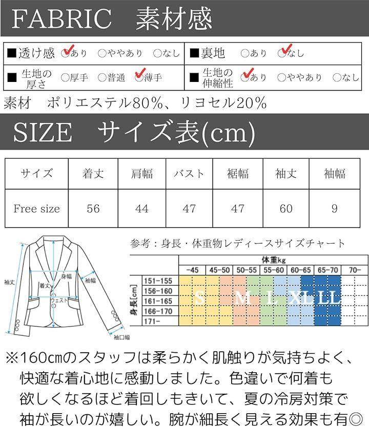 「素材」ポリエステル80%、リヨセル20% 「カラー」ホワイト、ベージュ、グレー、グリーン、ブラック「サイズ(cm)」free size 着丈56/肩幅44/バスト47/裾幅47/袖丈60/袖口幅9
