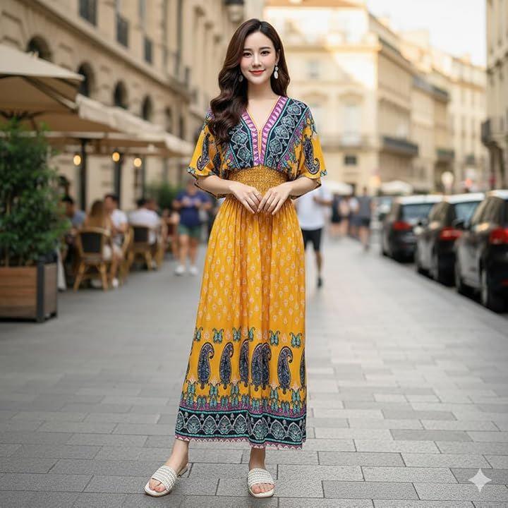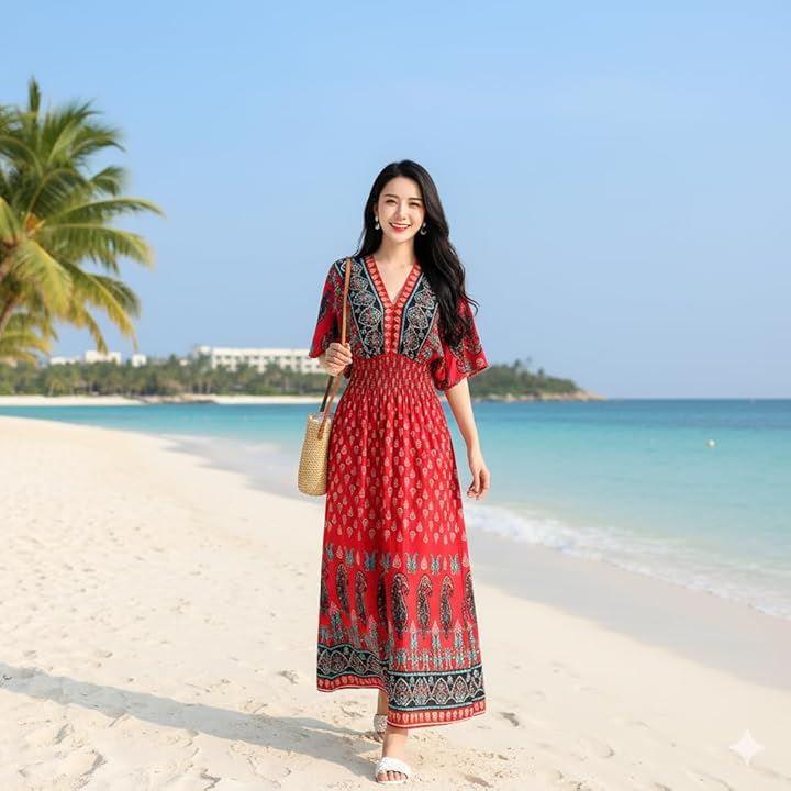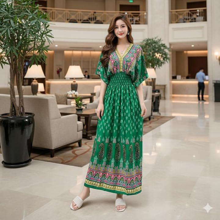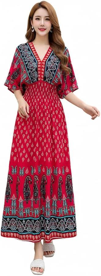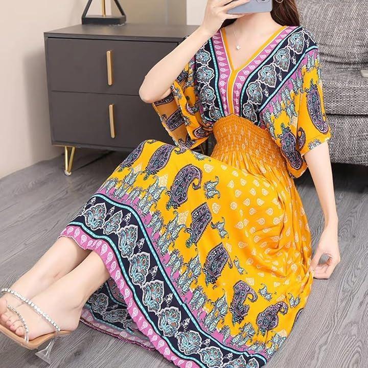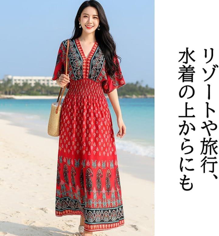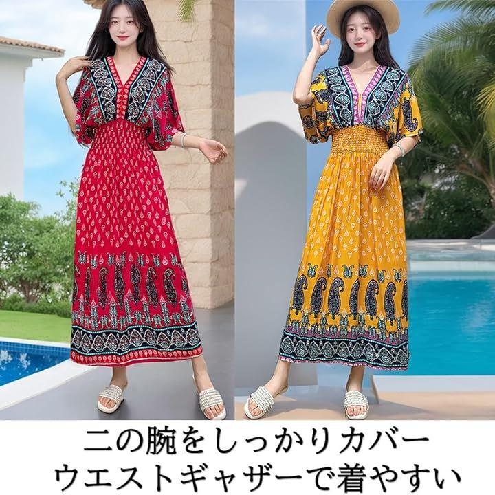 美しいエスニックデザインのロングワンピースで、リゾートやルームウェアにもぴったりな一着が登場しました。