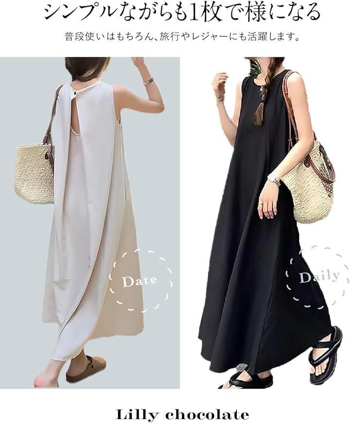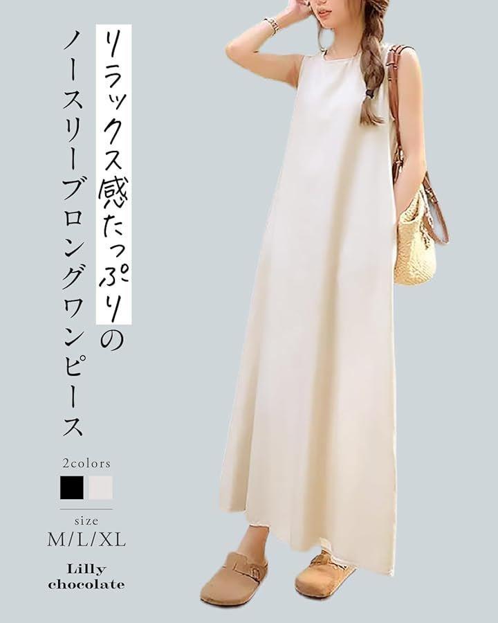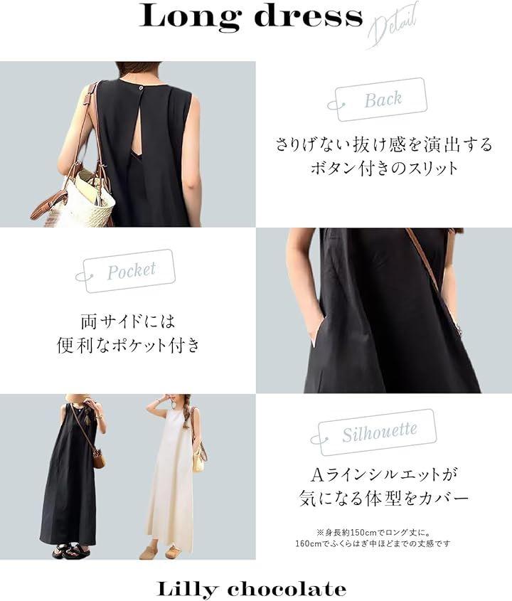 「デザインと特徴」 ナチュラルでリラックス感たっぷりのノースリーブロングワンピース。