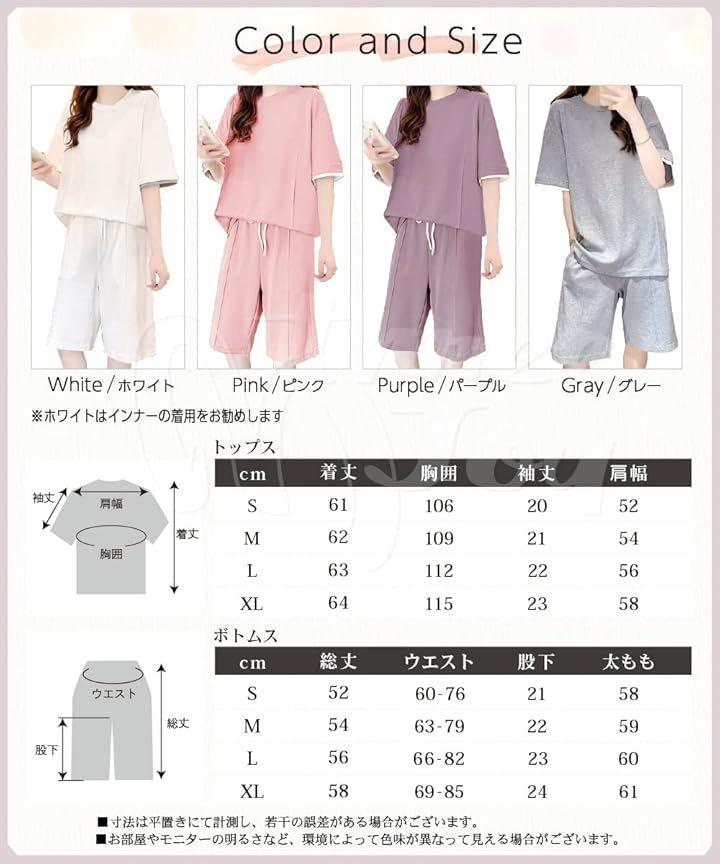 「サイズ」 トップス 着丈/胸囲/袖丈/肩幅「S」61/106/20/52「M」62/109/21/54「L」63/112/22/56「XL」64/115/23/58 ボトムス 総丈/ウェスト/股下/太もも「S」52/60~76/21/58「M」54/63~79/22/59「L」56/66~82/23/60「XL」58/69~85/24/61 *サイズに若干の誤差が生じる場合がございますのでご了承ください。