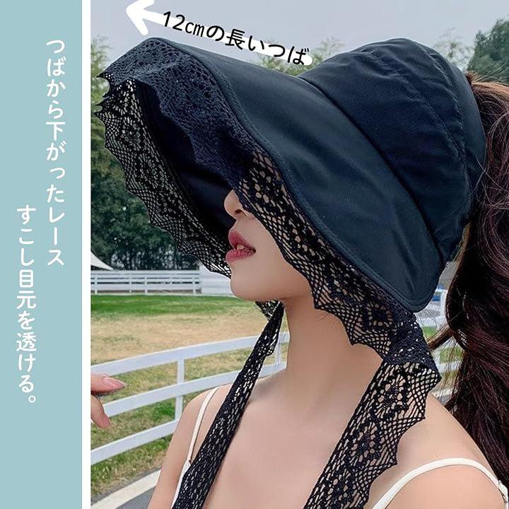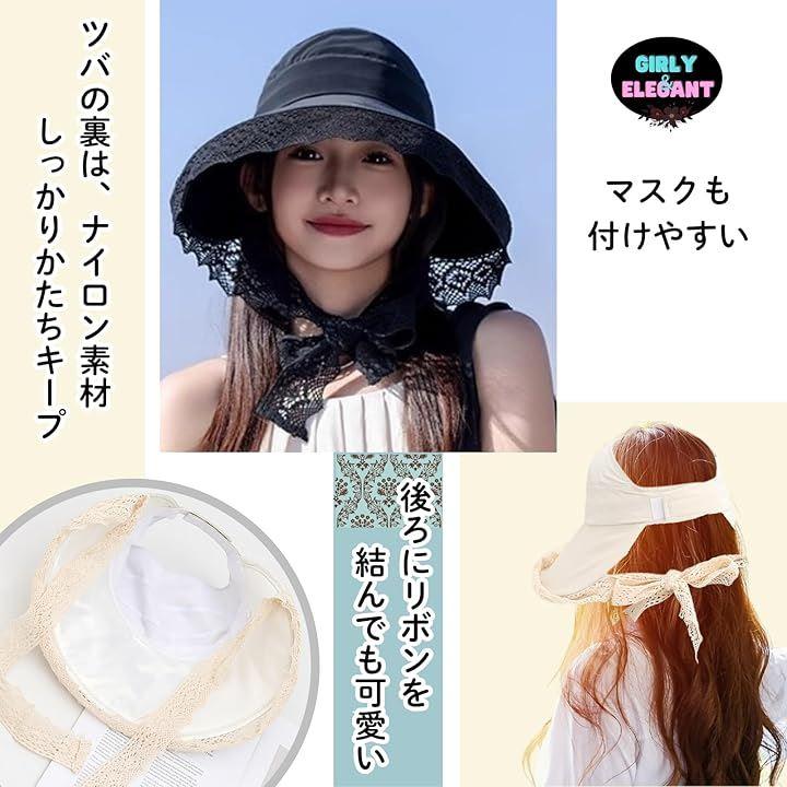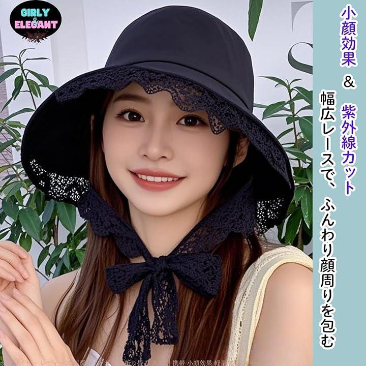 「エレガントなレース使い。おしゃれに紫外線対策」 つばの縁取りから顔輪郭に続いている幅広のレースを顎下で結ぶと、つばが顔周りを軽く包むような形になります。