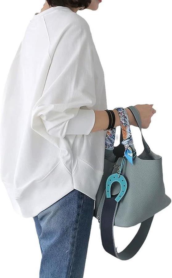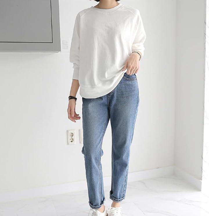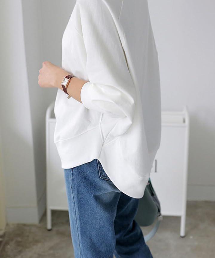 ゆったりトレーナーを着るとバストのボリュームも目立ちにくくなり、着痩せ効果抜群。身体のラインをひろいすぎないゆったりシルエットで体型カバー効果もあり。