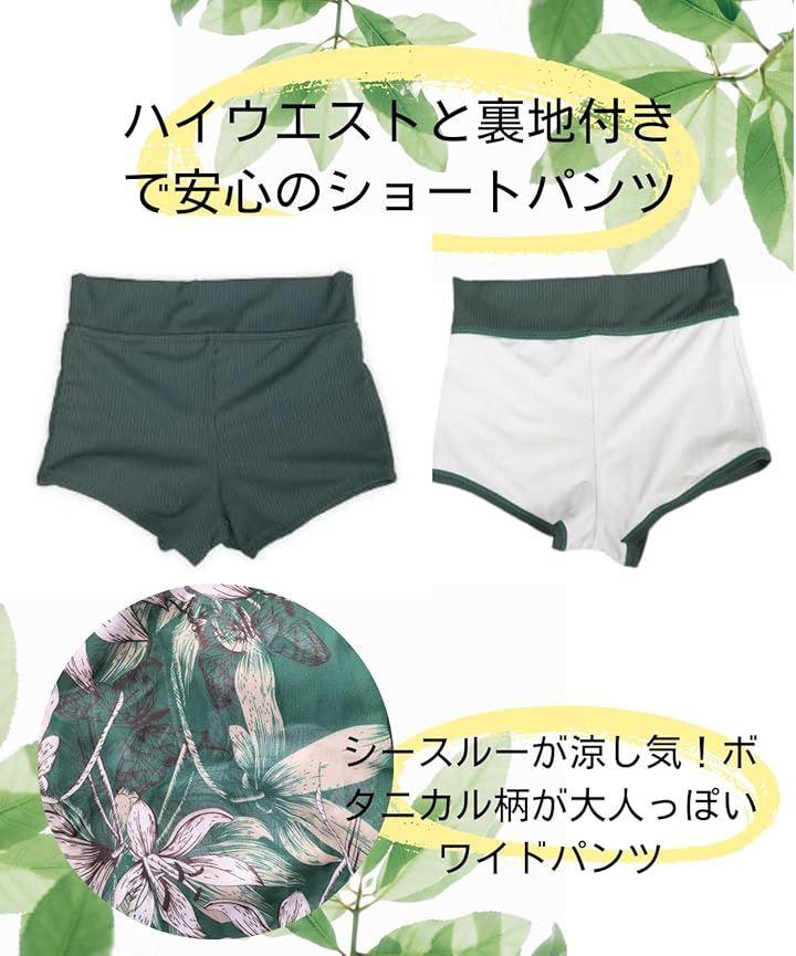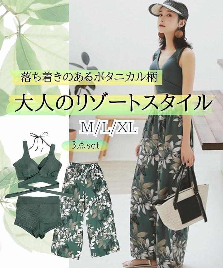 ビキニ・パンツ、ボタニカル柄の3点セットの水着。