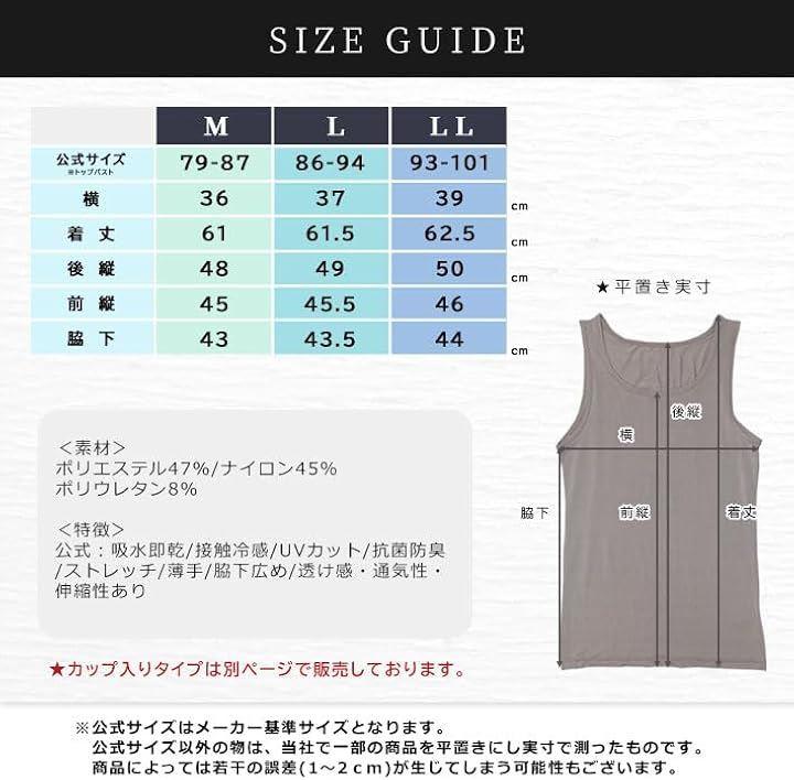 「特徴」吸水速乾/接触冷感/UVカット/抗菌防臭/ストレッチ/アジャスターなし・肩紐調整不可/透け感・通気性・伸縮性あり