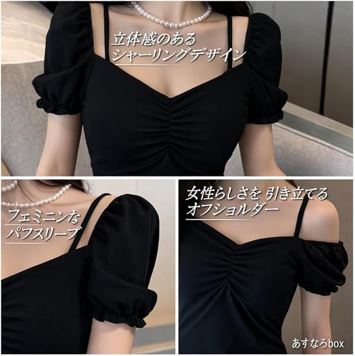 シャーリングで美シルエット: ウエストからヒップにかけて施されたシャーリングデザインが立体的なラインを作り、ボディラインをきれいに見せます。