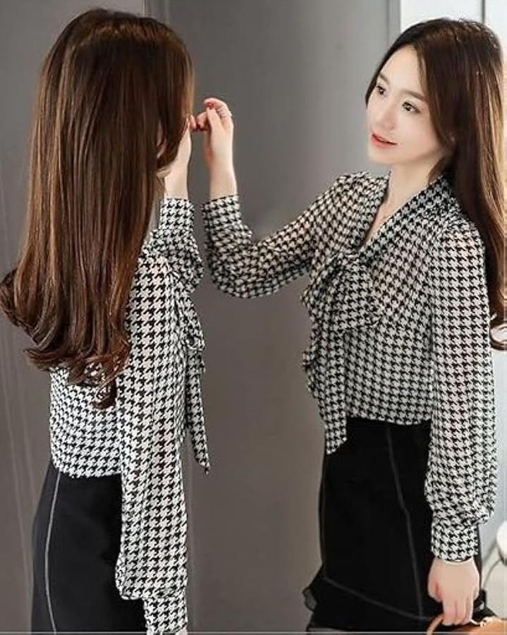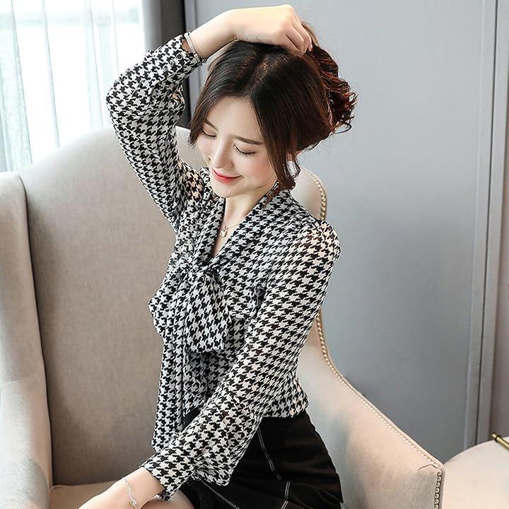 胸元のリボンがアクセントになって、可愛さとおしゃれが両立でき、千鳥格子柄が上品なデザインのブラウス。