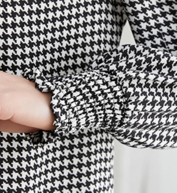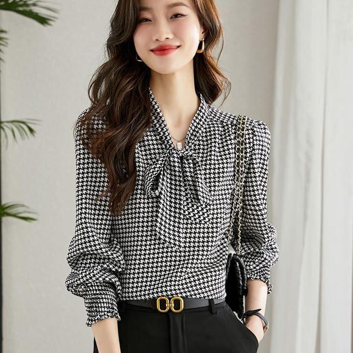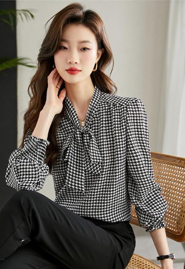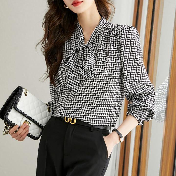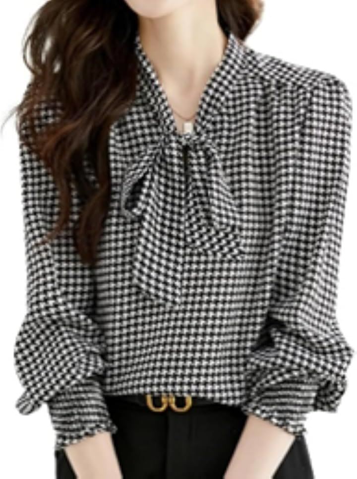 胸元のリボンがアクセントになって、可愛さとおしゃれが両立でき、千鳥格子柄が上品なデザインのブラウス。
