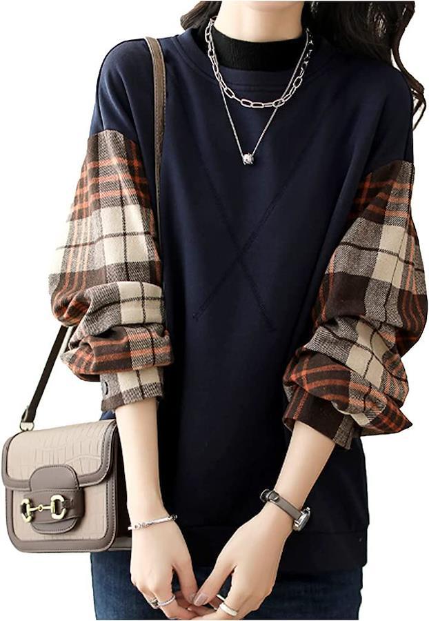 紺色トレーナーとブラウンチェックシャツのドッキングデザインになります。
