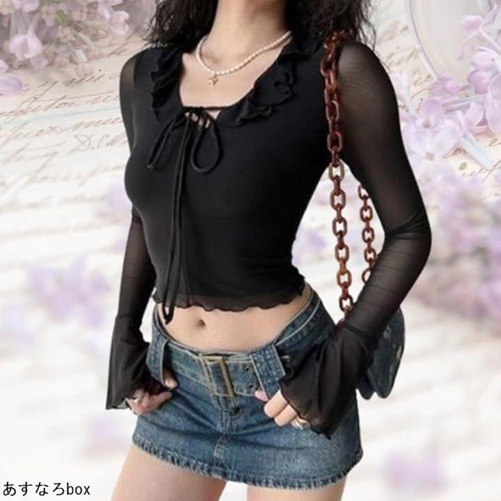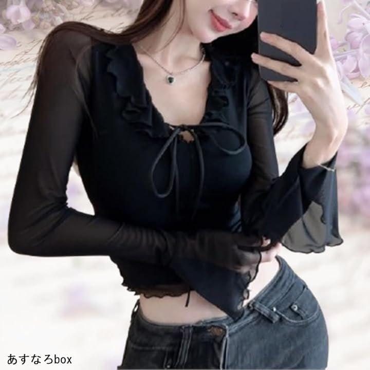 Women's tops, long sleeves, sheer sleeves, ribbon tie, ruffle neck, sheer, plain, figure-covering, for commuting, neat, office, slimming