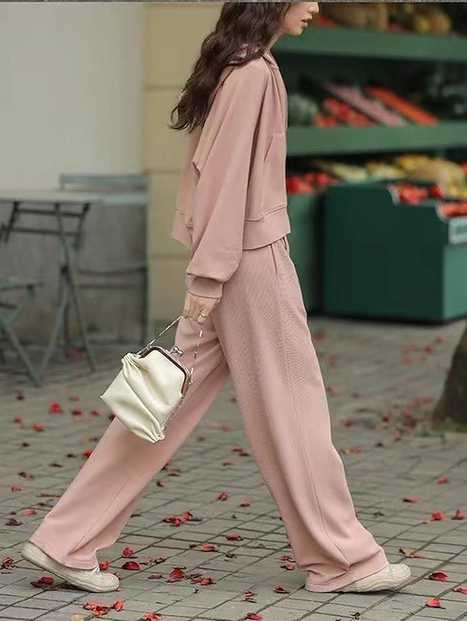ワイドシルエットで脚長効果も〇 「ジャージ 上下 レディース」「スウェット セットアップ」「ゆったり シルエット」を意識したおしゃれなカジュアルスタイルです。