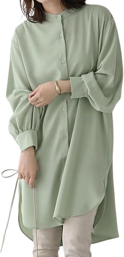 「シャツワンピース」ふんわりとしたパフスリーブの袖が魅力のレディースの長袖 チュニックワンピースです。