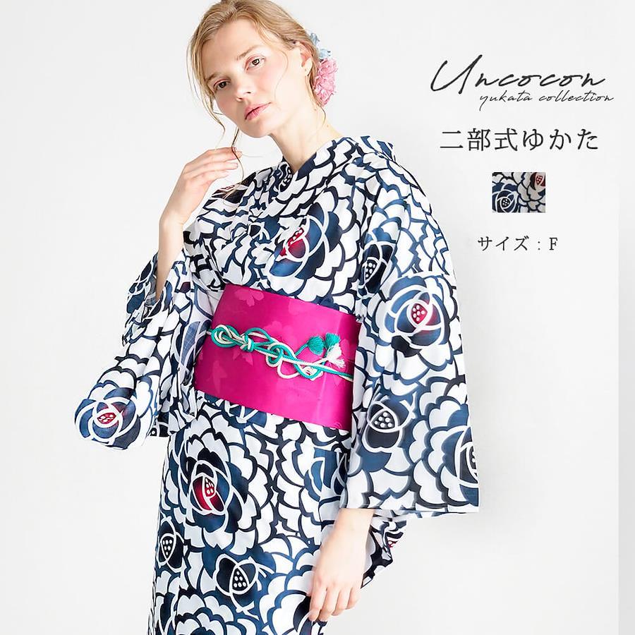 浴衣を着たいけれど、着付けがむずかしそう・・・そんなあなたにおすすめなのが、この二部式セパレート浴衣。上下が分かれていて、下は巻きスカートタイプなので、自分ひとりでもサッと着られます。お洋服のような感覚で着用できるので、浴衣初心者さんや忙しい方でも気軽に楽しめます。