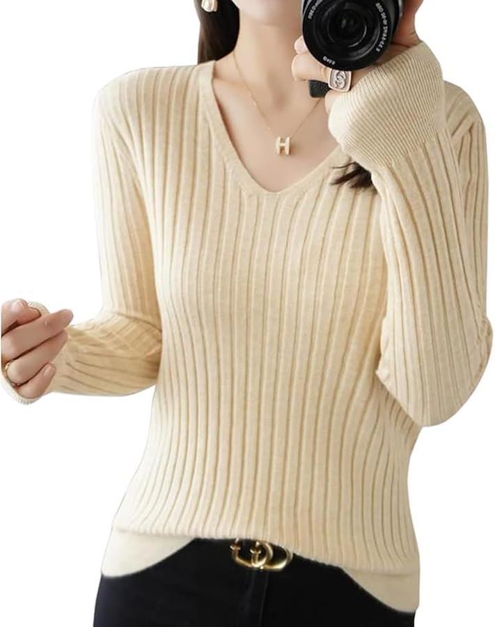 Women's V-neck Sweater, Ribbed Knit Top, Long Sleeve, Cut and Sewn, Perfect for Spring and Autumn, Office Casual, and V-Neck