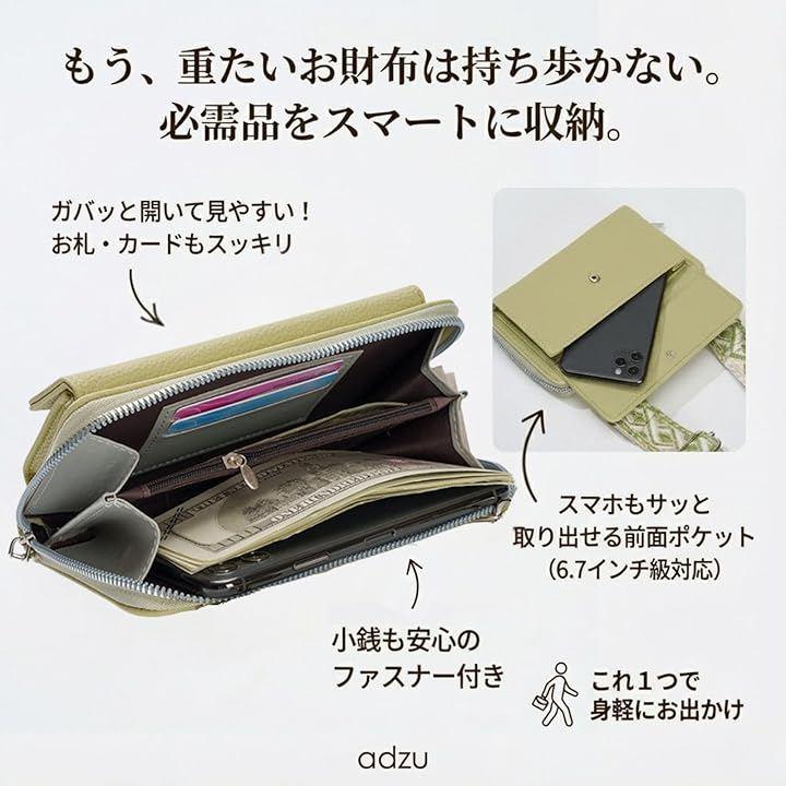 「収納構造・内部レイアウト」 メインにはスマートフォン、現金、チケット、カード類など日常の持ち物をまとめて収納。