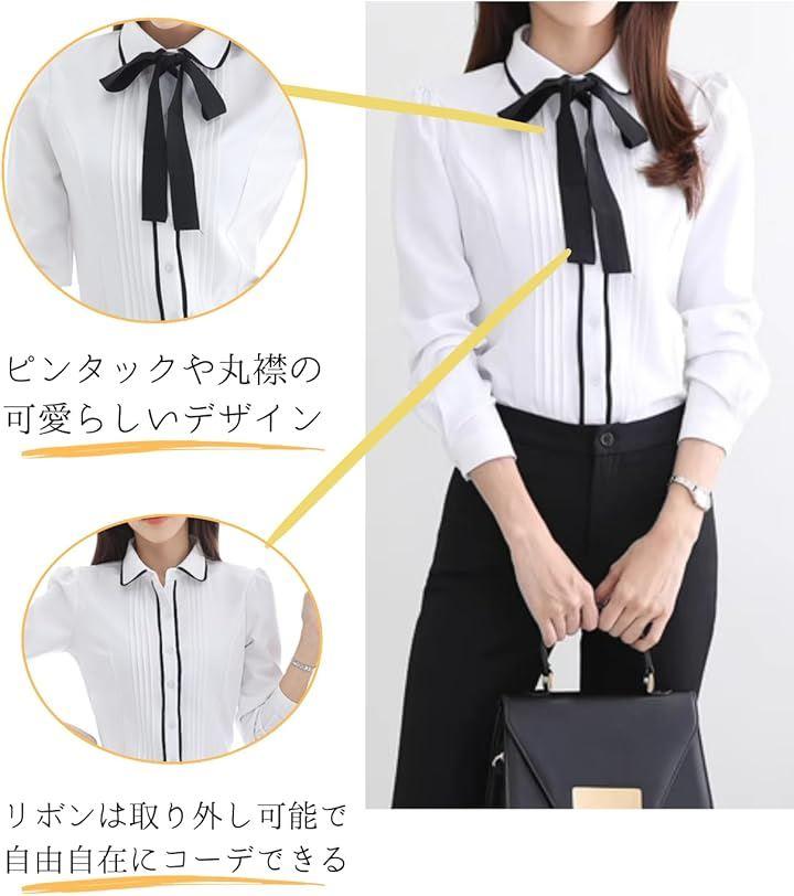 襟付きブラウスとしても、リボン付きブラウスとしても楽しめる2Way仕様で、気分やシーンに応じたスタイルが可能です。