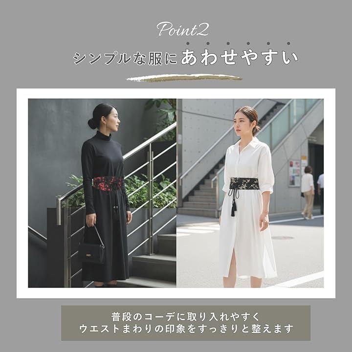 「デザイン・印象」 光沢感のあるサテン調ジャカード生地を使用した、帯風デザインの幅広ベルトです。