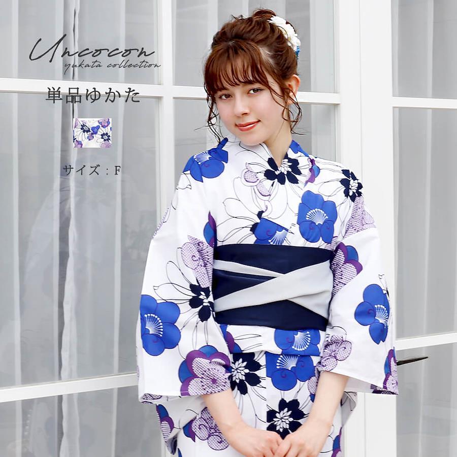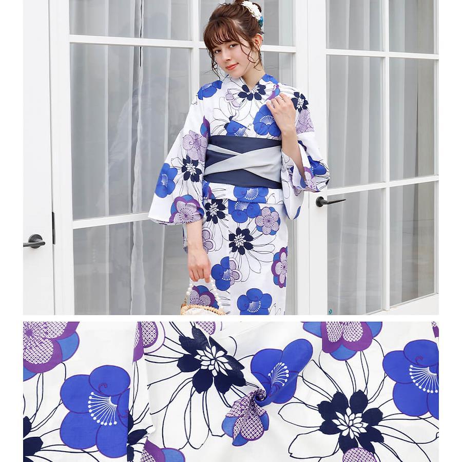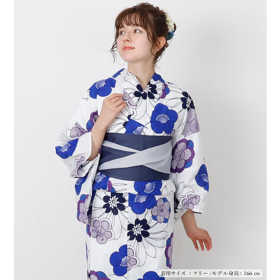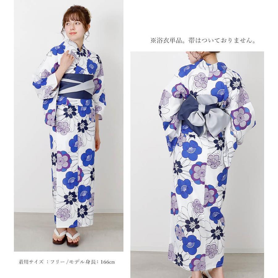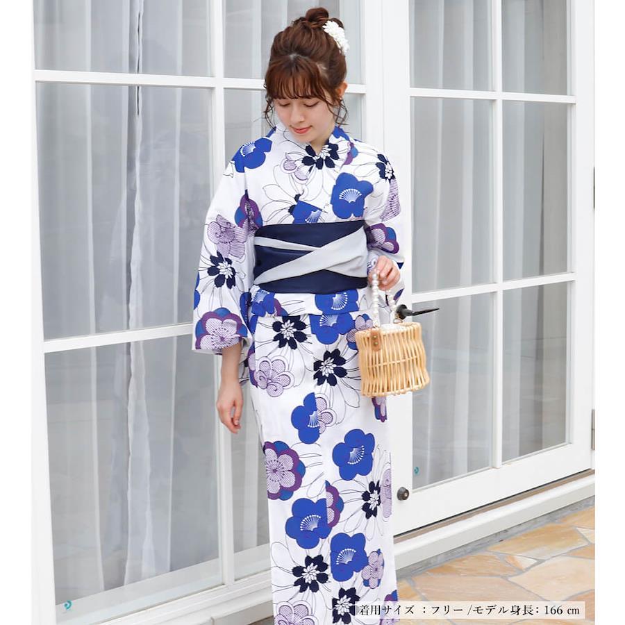 落ち着いた白地にブルーとパープルの花柄をあしらったデザインは、大人っぽさと可愛さを両立。帯とのコーディネート次第で上品にも華やかにも仕上がります。夏祭りや花火大会、カフェ浴衣コーデにも最適です。